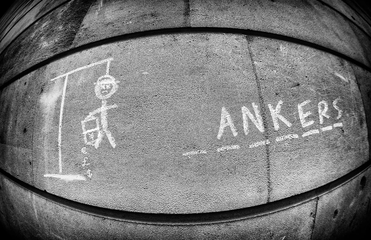 A game of hangman being played on the side of the Bank of England in 2009. This was during the protests about the collapsed banks being bailed out by the government. Fill in the missing blank.