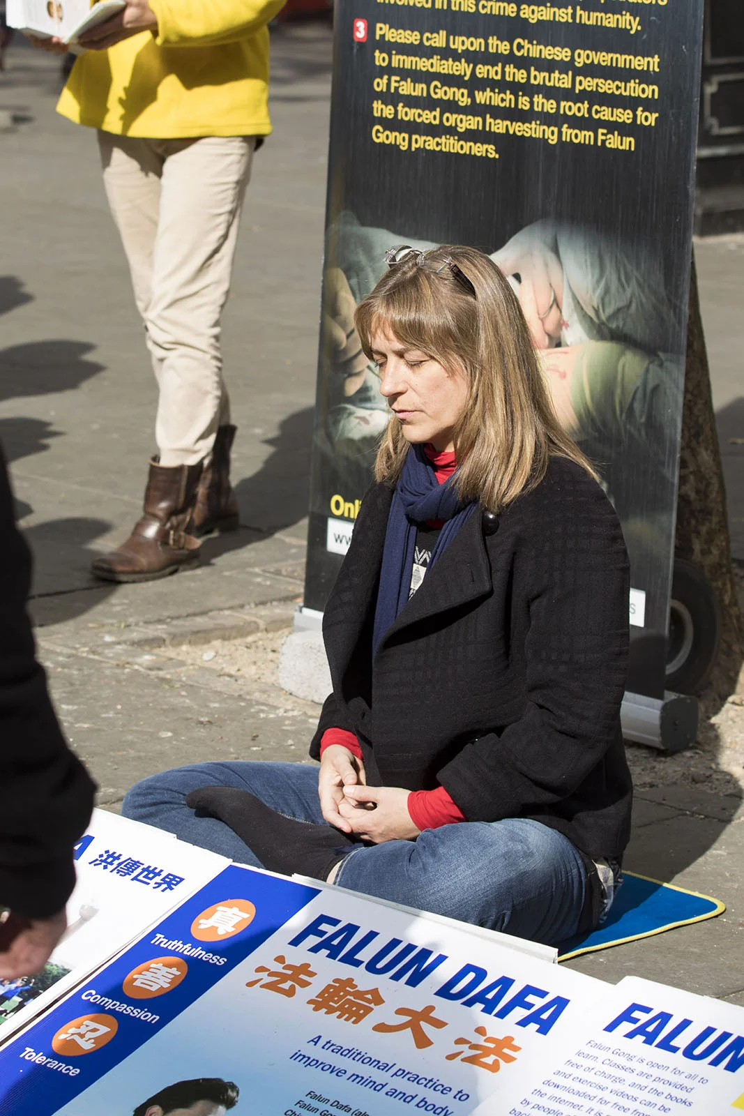London Falun Gong practitioners Commemorate April 25th 1999 by St Martin in the Fields Church, Trafalgar Square. The first peaceful appeal against the persecution of Falun Gong in China. They do this by showing the beauty of meditation exercises, talk to people, collect petition signatures and hand out information and paper Lotus flowers.